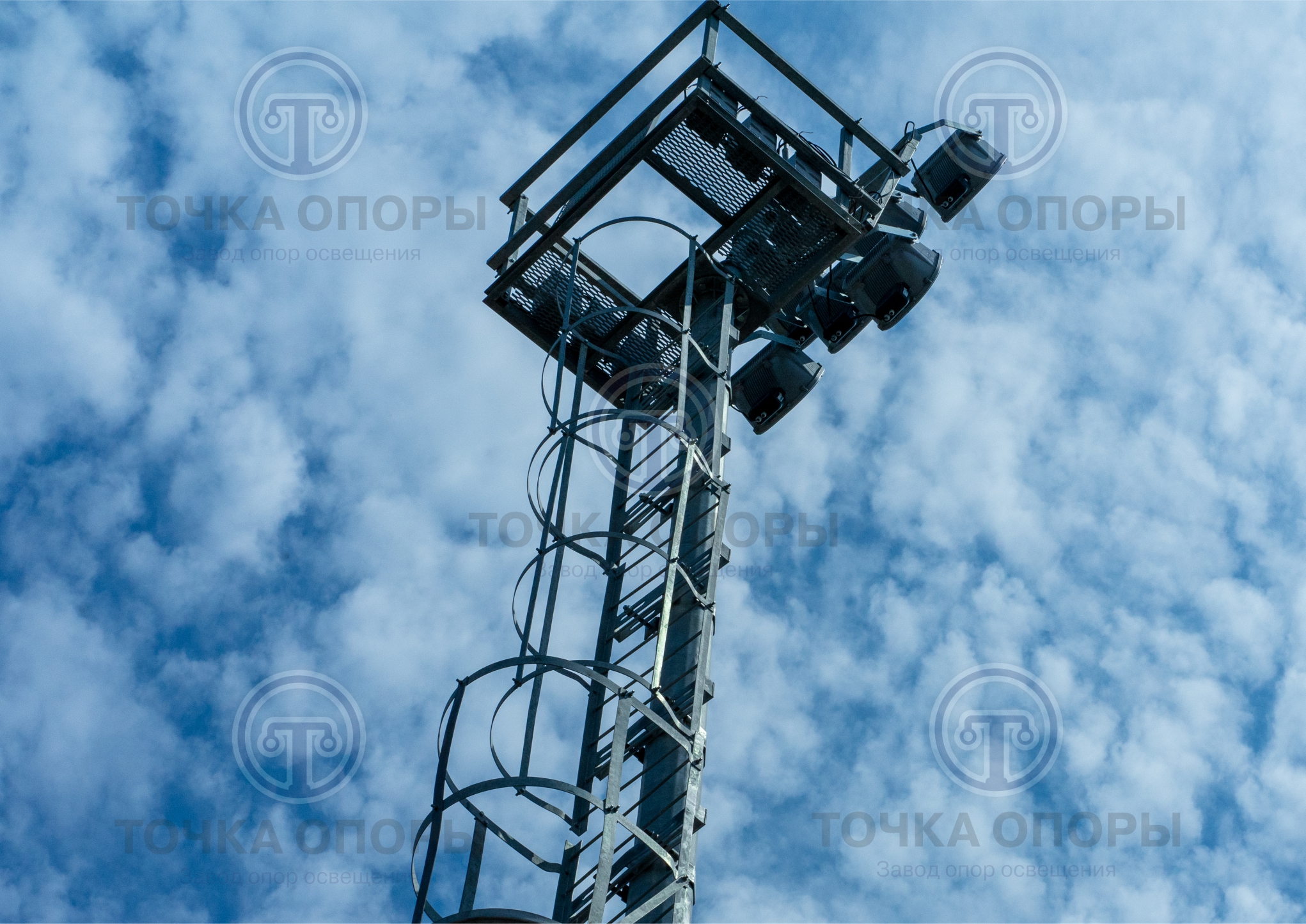Лестницы на мачту освещения со стационарной короной могут устанавливаться разного типа, как с защитным ограждением, так и без него, но с наличием страховочного троса.